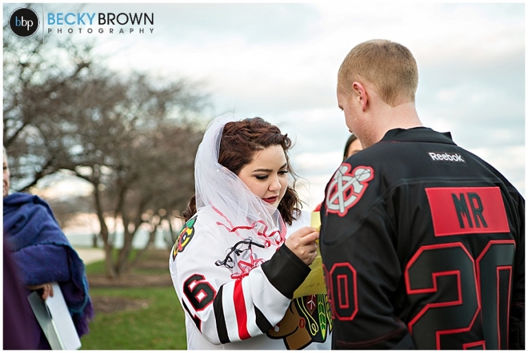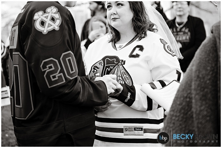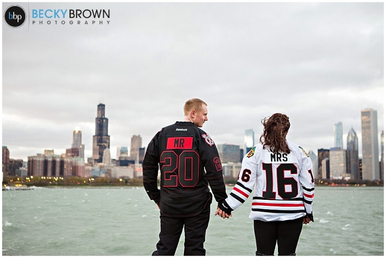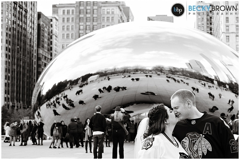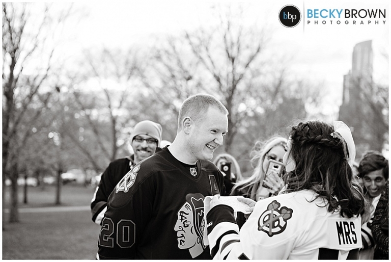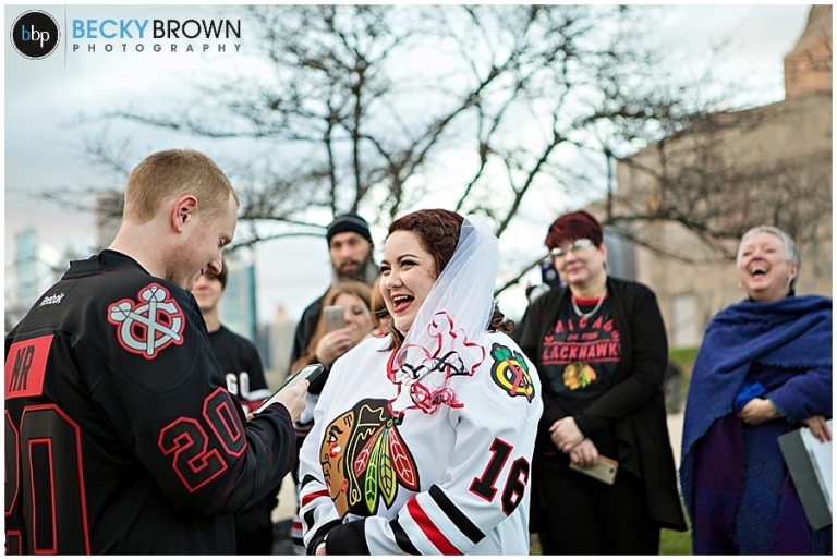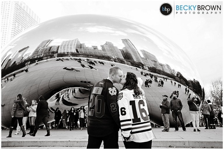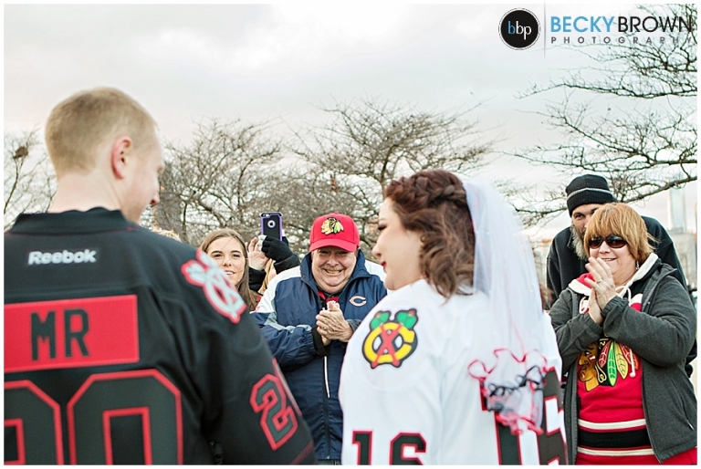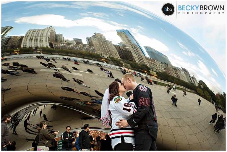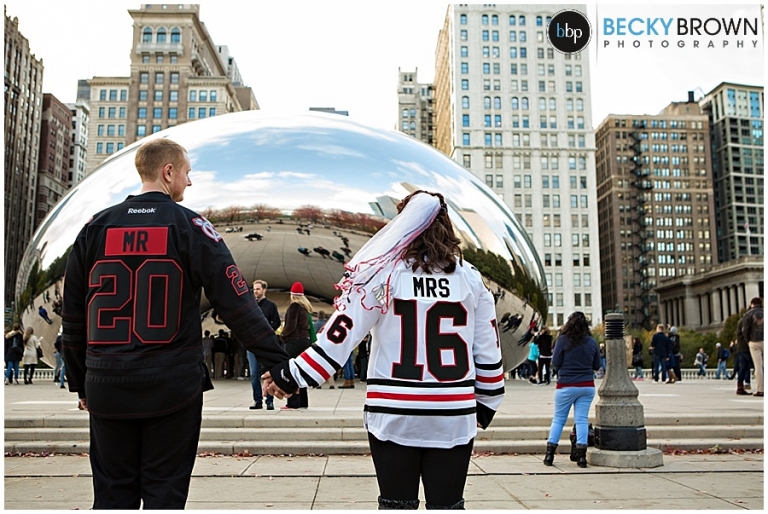 I met them at Cloudgate (aka the Bean) for some photos before their ceremony. I instantly fell in love with them and their matching Mr. and Mrs. Blackhawks jerseys. Morgan even had a matching veil! For their “reception” they took they guests to dinner and off to watch the Hawks game. How awesome is that?!