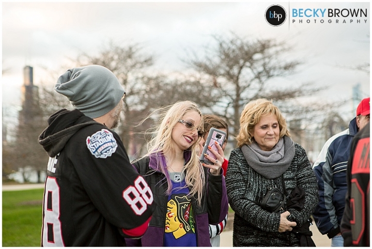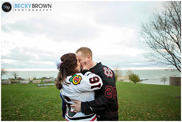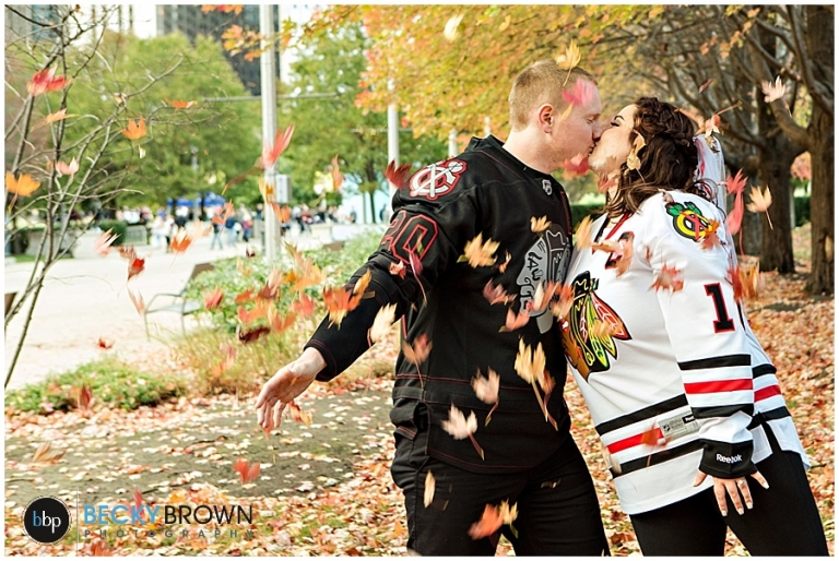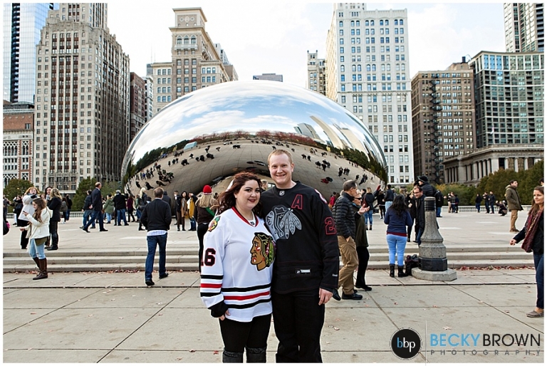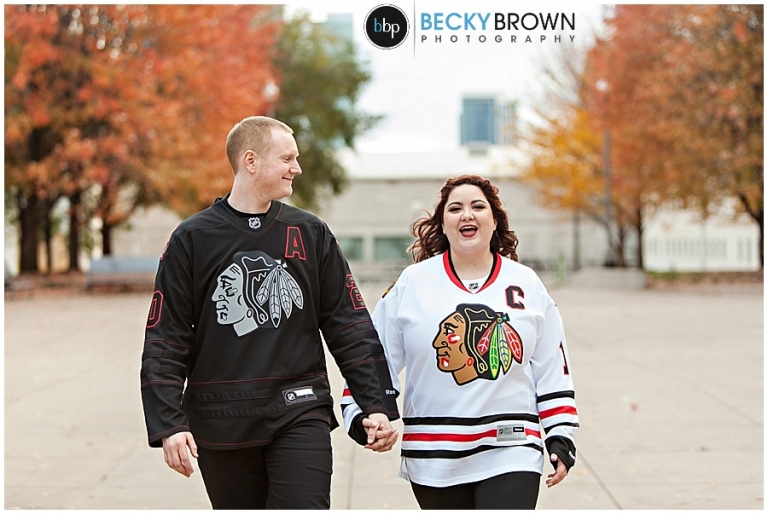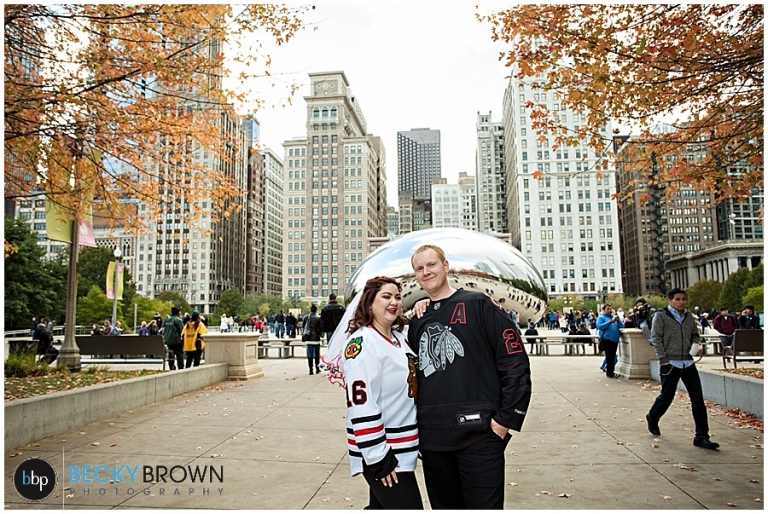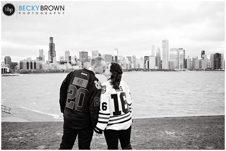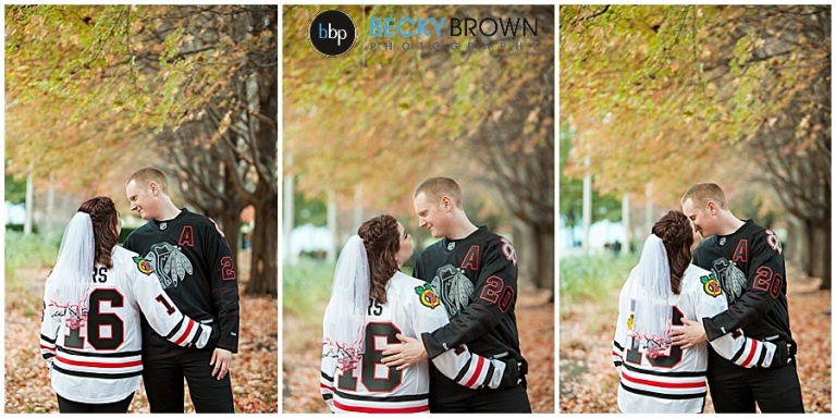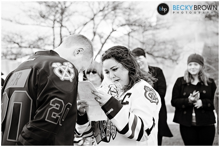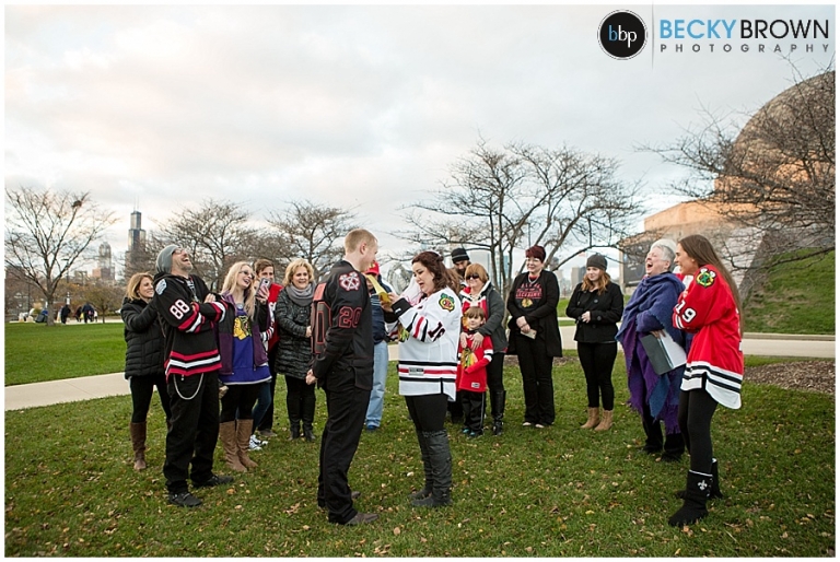 I met them at Cloudgate (aka the Bean) for some photos before their ceremony. I instantly fell in love with them and their matching Mr. and Mrs. Blackhawks jerseys. Morgan even had a matching veil! For their “reception” they took they guests to dinner and off to watch the Hawks game. How awesome is that?!