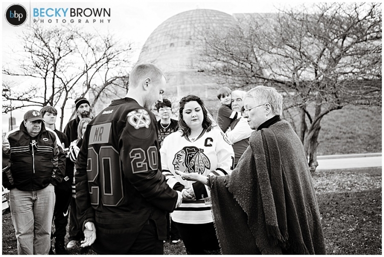 After some photos downtown we headed out to Museum Campus to meet their friends and family for the ceremony. Although it was only November it was a very very cold windy day and being by the lake made it feel even colder. Everyone snuggled up together as they said I do and laughed and cried during their personal vows.
