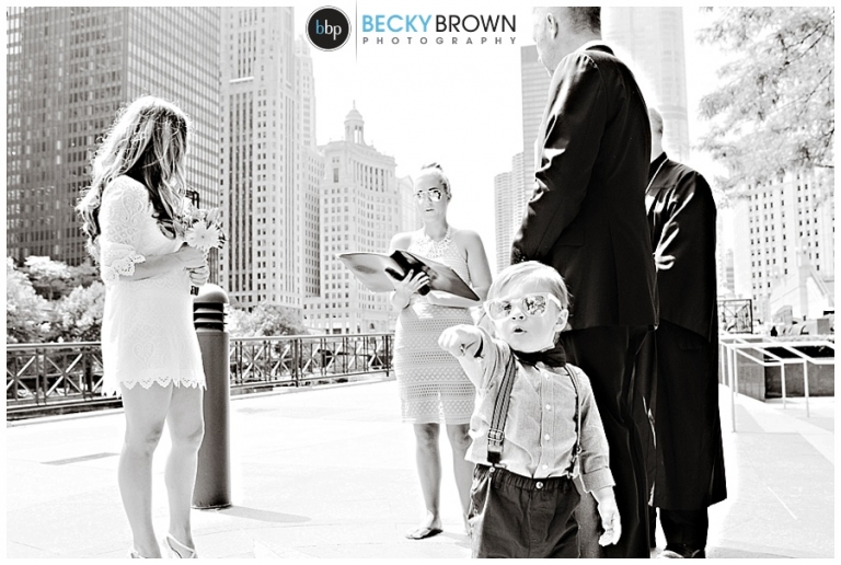 Meet Christen & Dan! They decided to elope along the Chicago Riverwalk with a few of their closest friends and family present including their son and daughters. Spoiler alert their son is the cutest ring bearer ever! And unknowingly they schedule their ceremony during the practice for the Chicago Air and Water show which was totally fitting as Dan is a pilot!