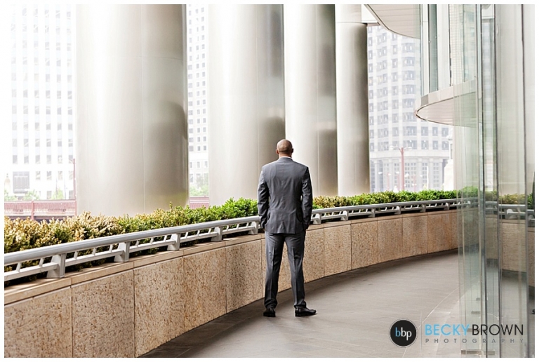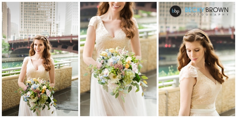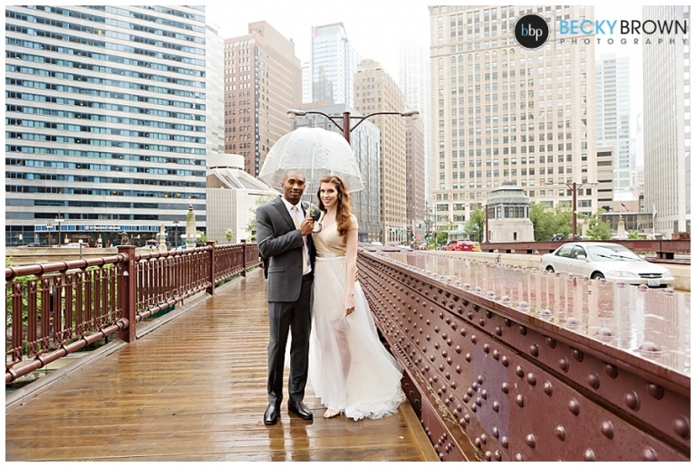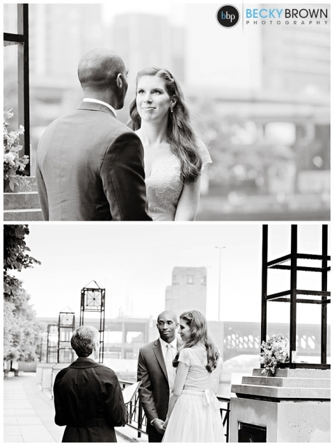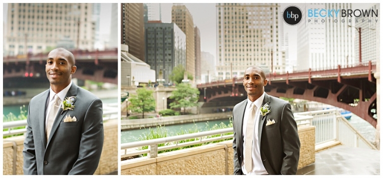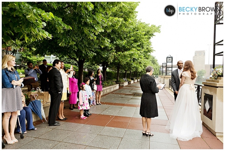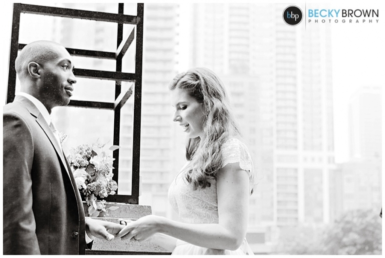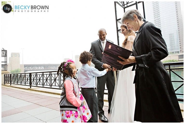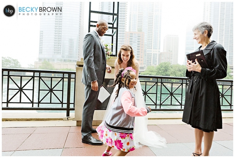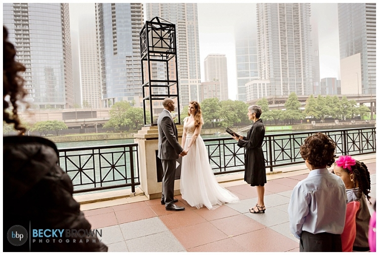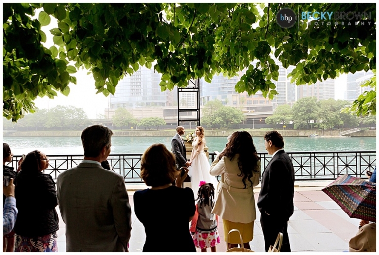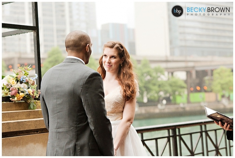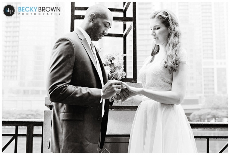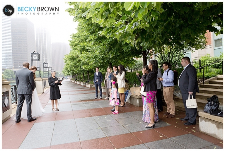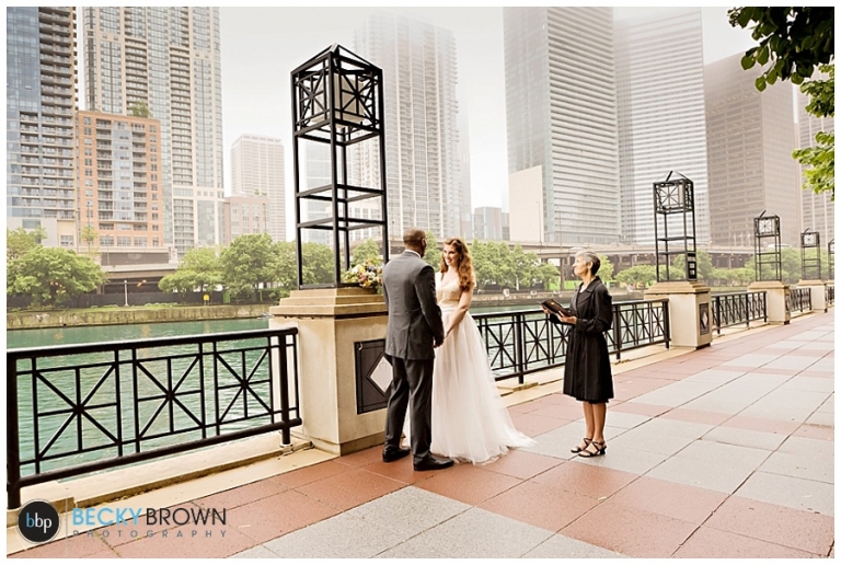 I met them at the Trump Hotel where they were staying for first look and portraits. I love the side walkway at the hotel for a number of reasons, but particulary in this case because it’s covered so we were able to shoot without getting drenched. After some portraits in that area we headed over to the riverwalk to meet their guests for the ceremony. Luckily the rain slowed to a mist while they said their I Do’s (you can see it picked up a bit by ring exchange as some drops are visible in the images).
