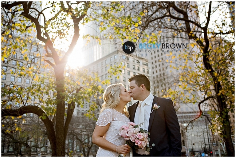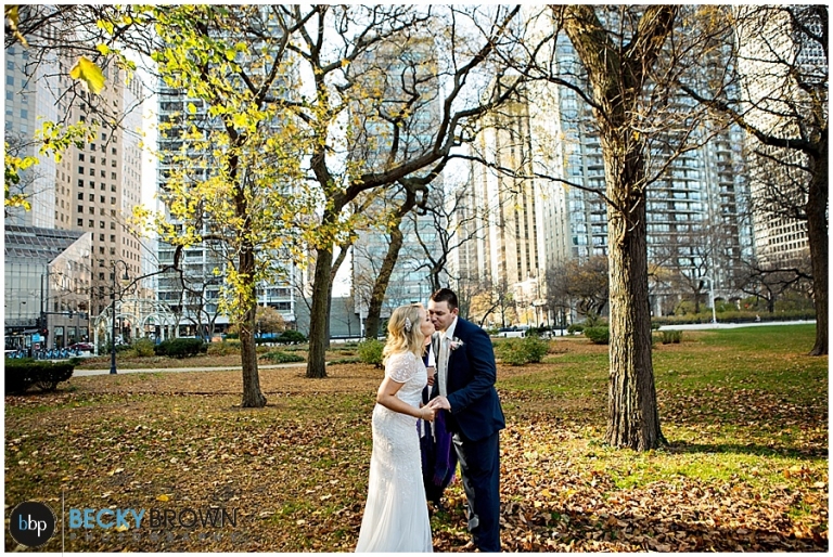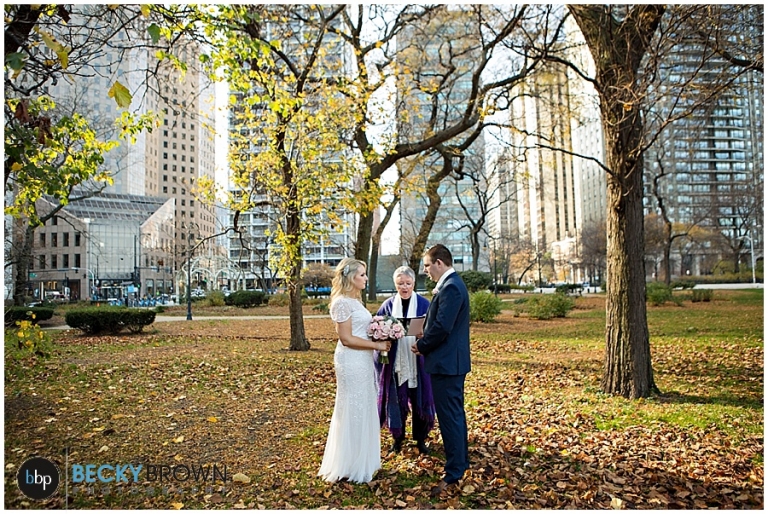 We got lucky that some of the fall leaves held out just long enough for their elopement (literally days later the trees were bare!). We met in the park near the Drake for their ceremony. The sun was perfectly peaking over the buildings as they said I do! After some photos we walked over to the lake. Thanks to it being November and a bit chilly we had the place to ourselves! It’s a good thing that Elaine had her gorgeous fur jacket and new hubby to keep her warm and snuggly!