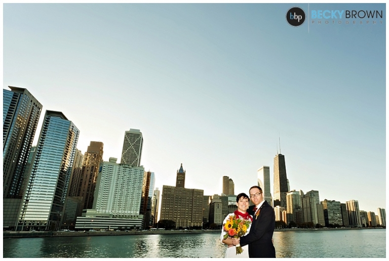 Christine created the most amazing fall bouquet to match their style and backgrounds. We headed to some favorite spots around the city, starting first at Lincoln Park which was full of gorgeous reds and yellows that perfectly matched their outfits! We ended the evening at Olive Park for their ceremony as the sun was setting over the Chicago skyline.