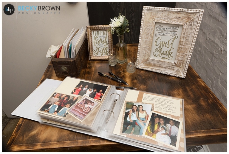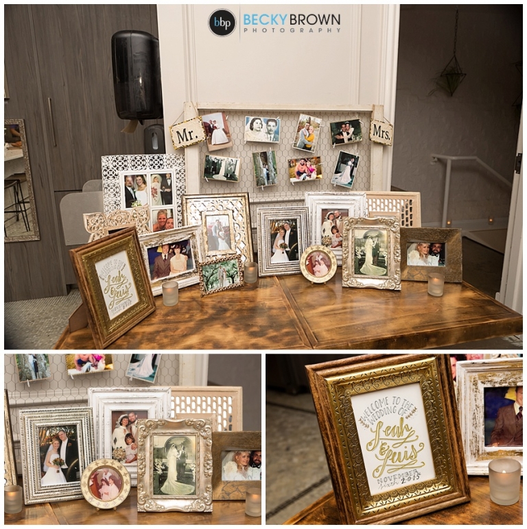 I loved how much they incorporated their family history and photos into the day! This whole table was full of previous wedding photos of family and guests. They also created a custom guest book that had a page with photos for each guest to leave them a message!