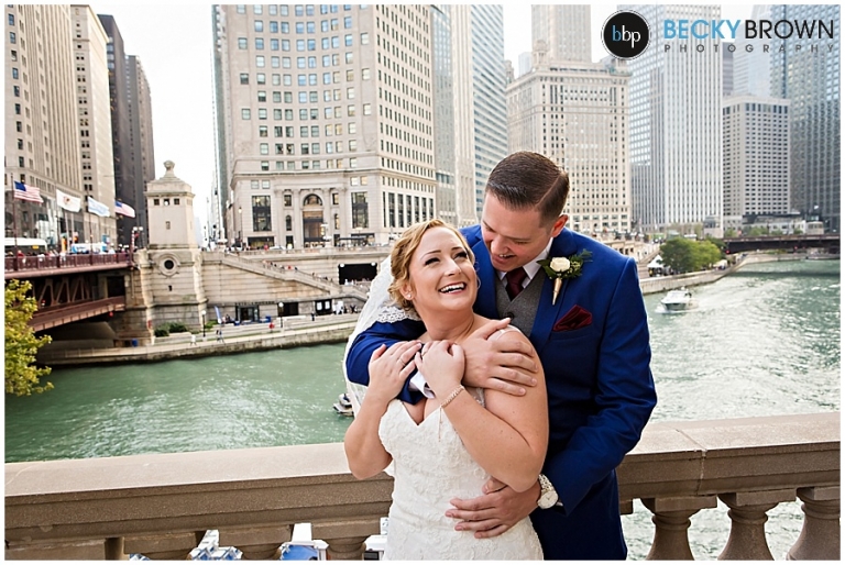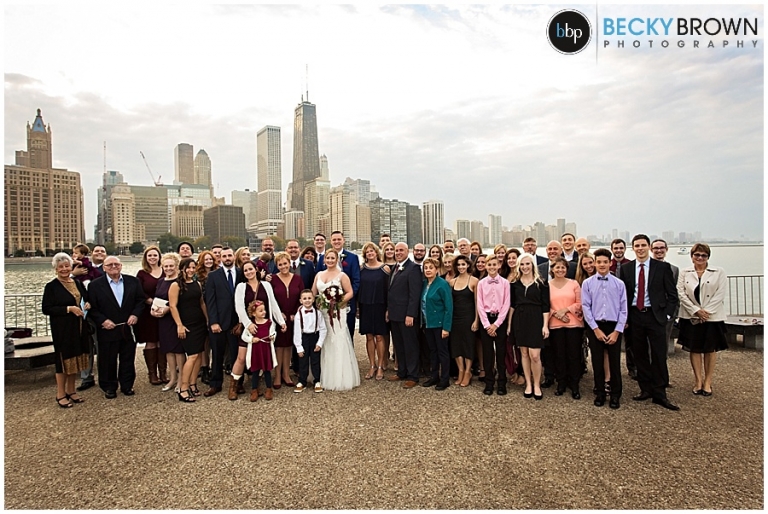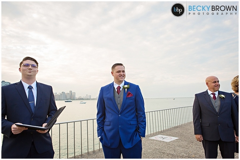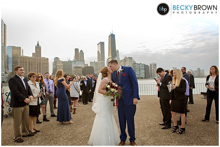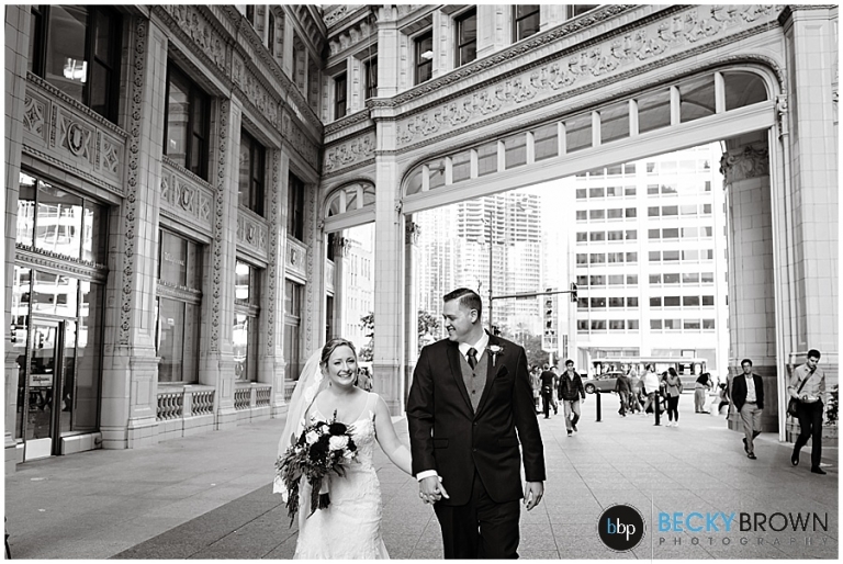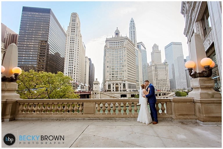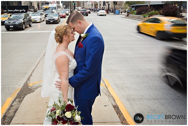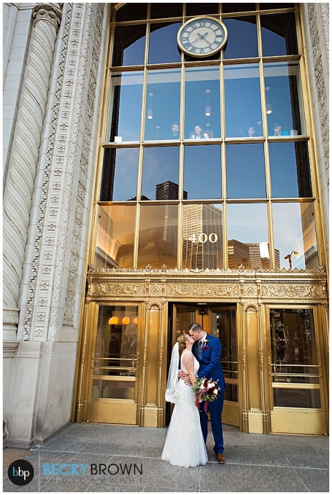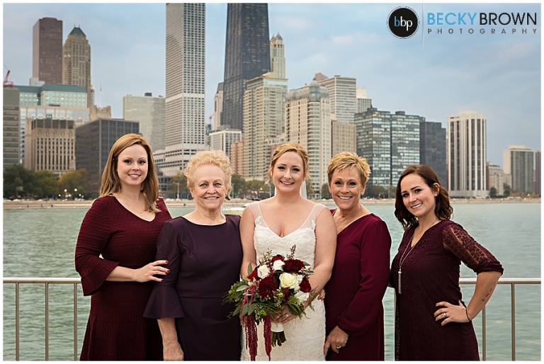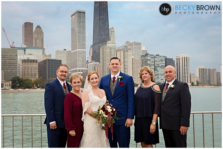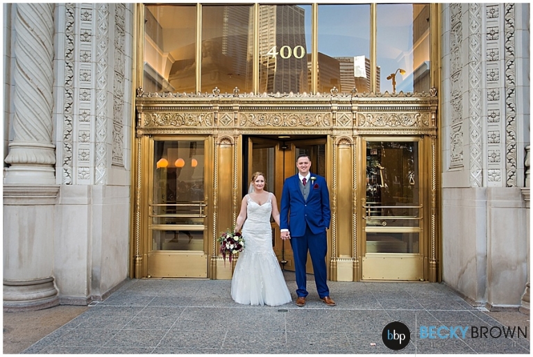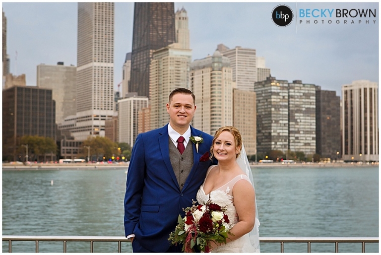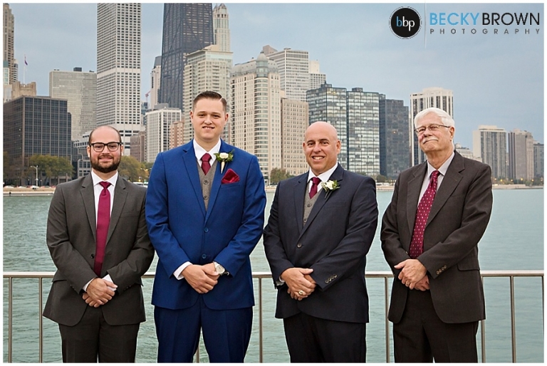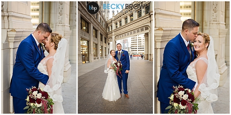 I met them at their hotel for a first look before headed out to the Wrigley Building for photos. I have to say that I love their color palette. Nathan wore a blue suit and the pop of crimson flowers was a perfect compliment. And most of their family followed along as well!