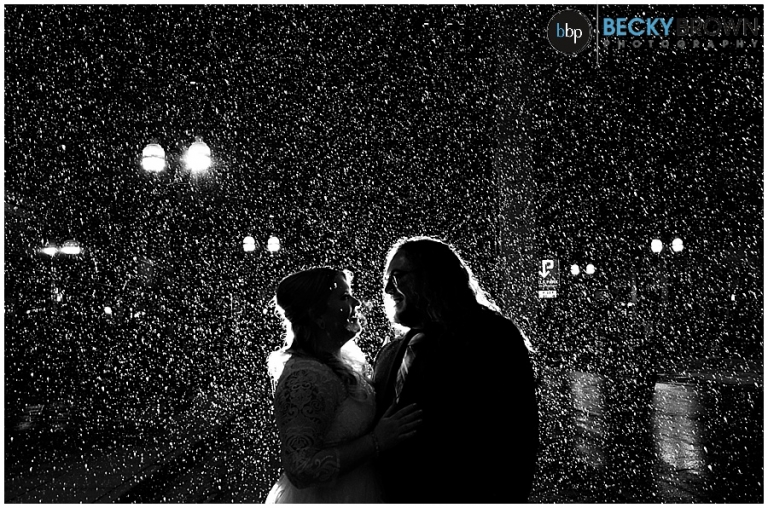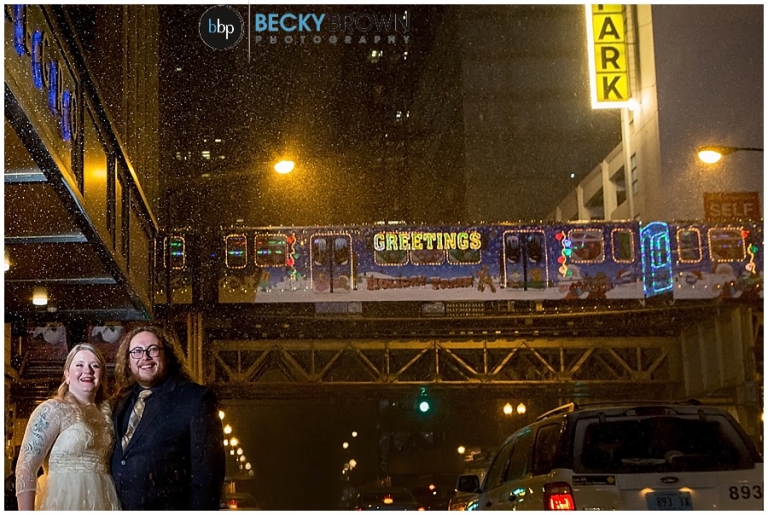 Before they headed off to dinner we wanted to do a few night photos. We stepped outside and within 10 seconds it started snowing. Big beautiful flakes. My happy photographer level went through the roof. So I started setting up my lighting and just then the CTA Holiday Train pulled up at the stop by the hotel. For those of you not familiar with it, every year the CTA decks out a train in Holiday lights complete with a Santa and everything. I’ve lived here for 5 + years and this was the first time I’ve seen it in person. I freaked out. And then I knew I had about 1 minute to get a photo in before it left that stop and I’m pretty sure I’ve never moved so fast in my entire life! See below for the photo! It was a holiday miracle!