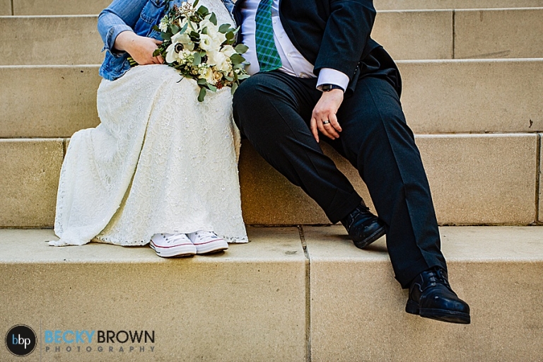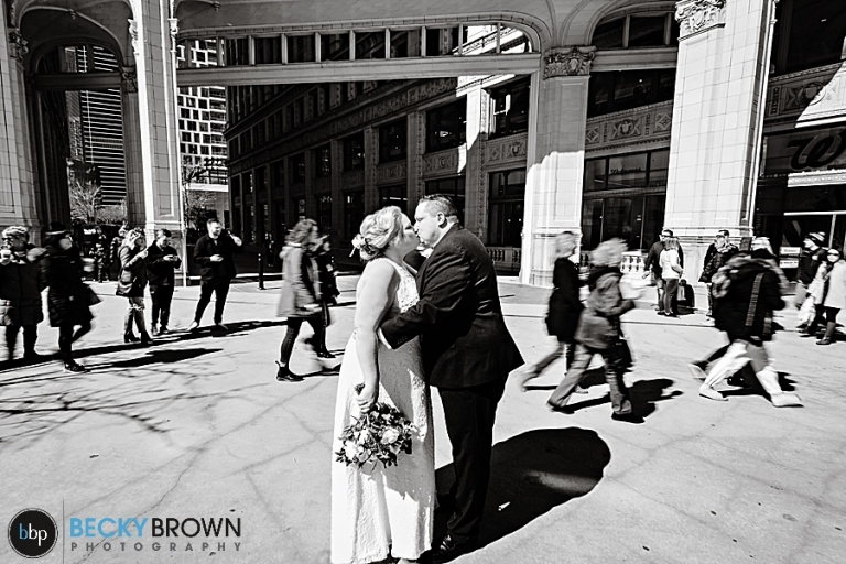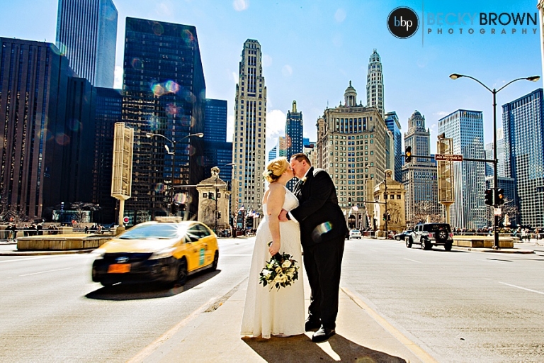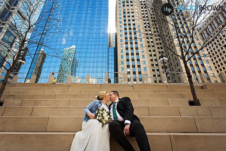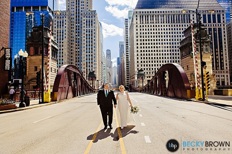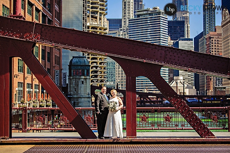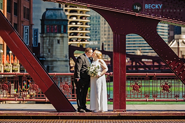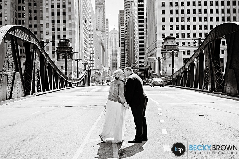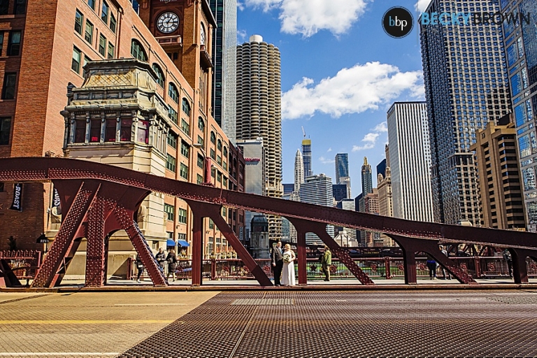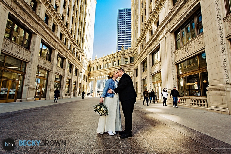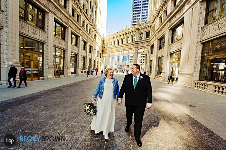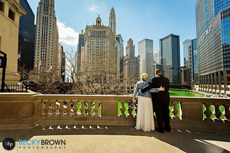 After their ceremony we popped some champagne and soaked in the view before heading out. I love that Michelle switched to her jean jacket and Chuck Taylors for outdoor photos. I’m always a fan of being yourself! It was still chilly, but thankfully we didn’t need to fully bundle up and the sun was out. We walked out to the Wrigley Building and Michigan Ave right nearby and headed over to LaSalle Bridge for all the best green river angles and views!