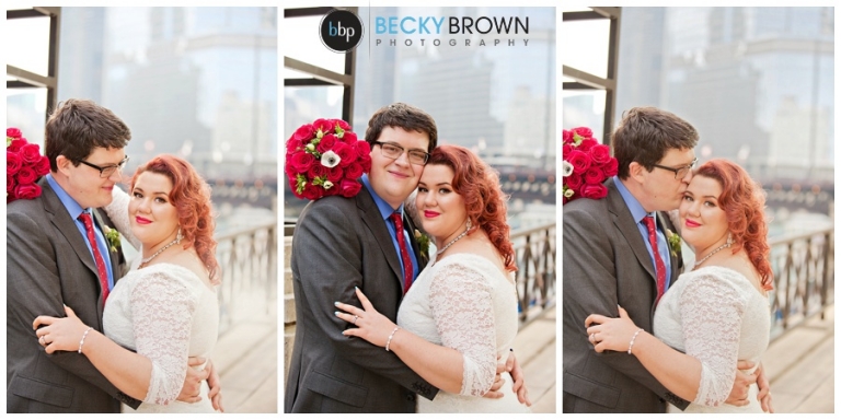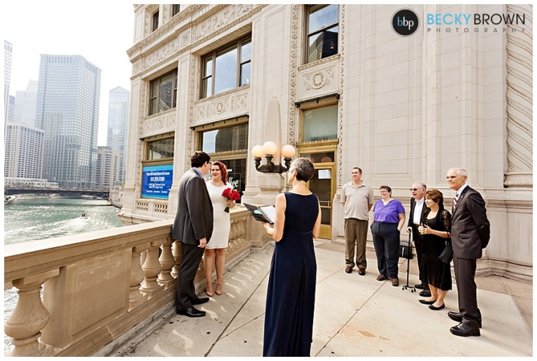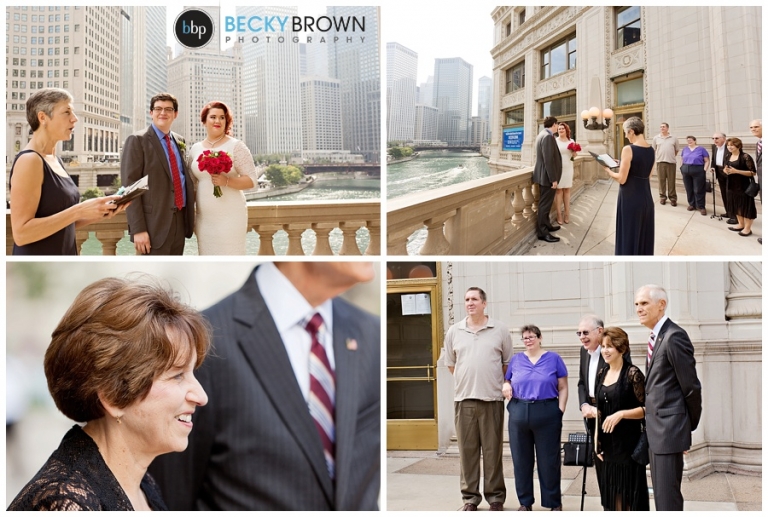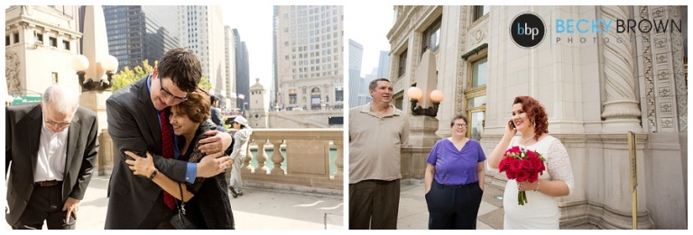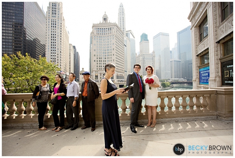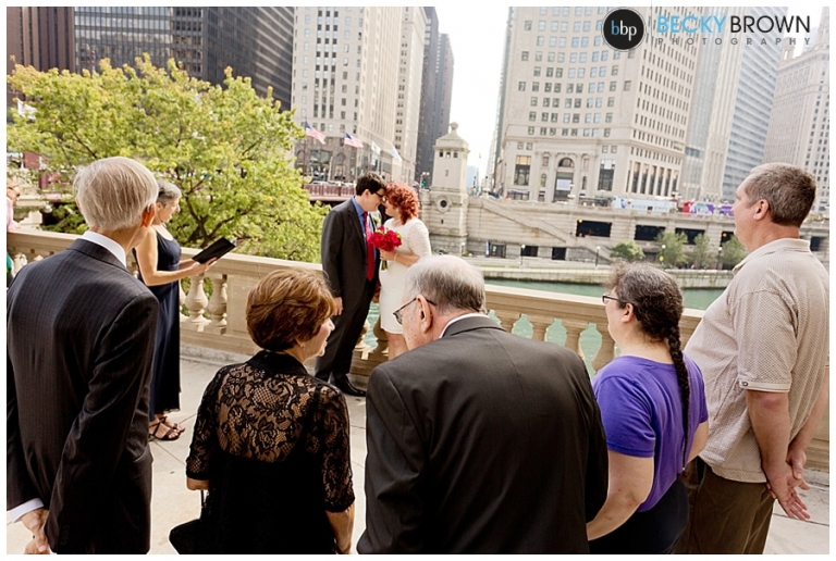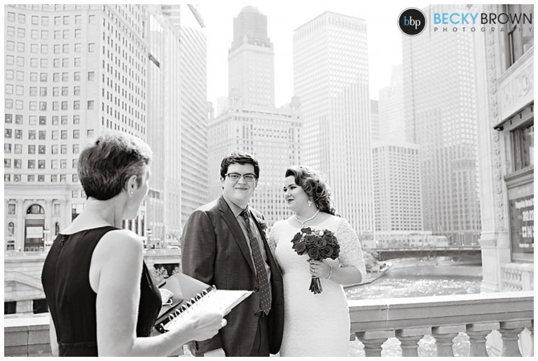 I love the view from this area, but it is right on Michigan Ave. so there is a lot of car and foot traffic. Emily told me she didn’t care if she had to scream her vows because she loved the spot so much! I can’t say I blame her! Aside from a group of tourists who decided to stop for a photo op right next to us mid ceremony (scroll down for that photo!) we had some space to ourselves. They exchanged vows in front of their parents and after saying their I do’s we made a couple more stops in the area.